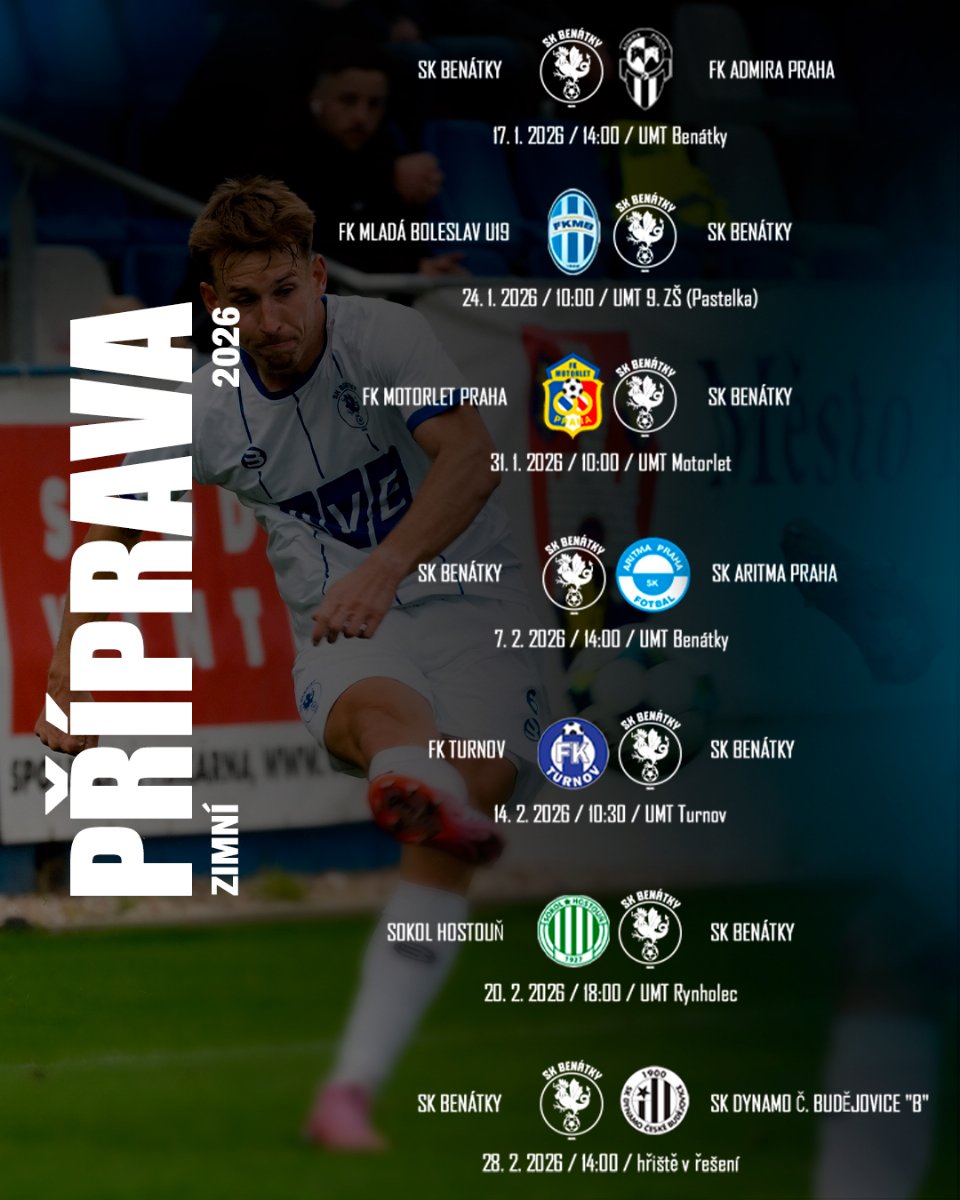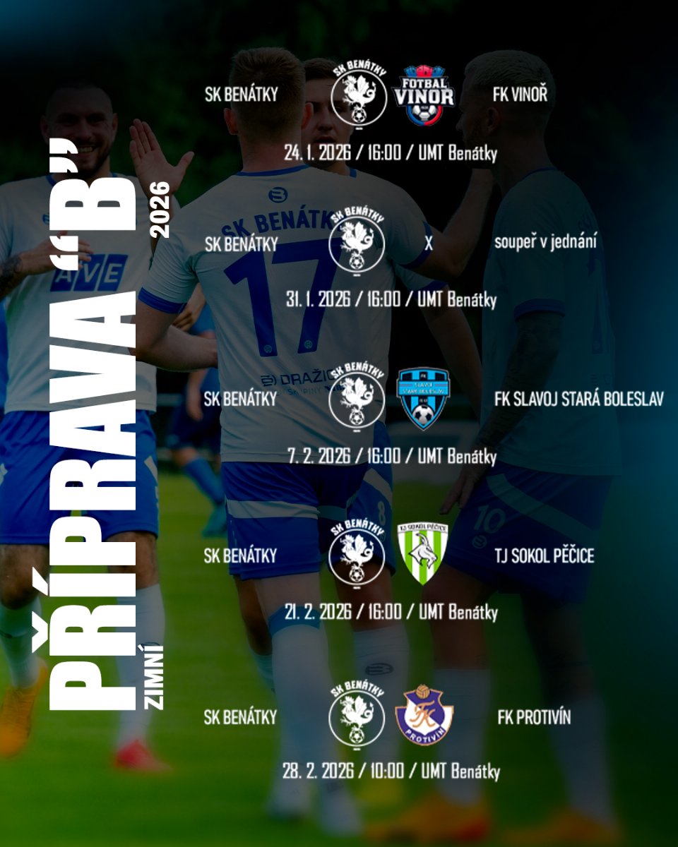 Benátecký fotbalový A-tým ⚽️ sehraje před jarními odvetami sedm přípravných zápasů 🗓️. Hned v pěti z nich bude čelit třetiligovým týmům 💪⚽️.